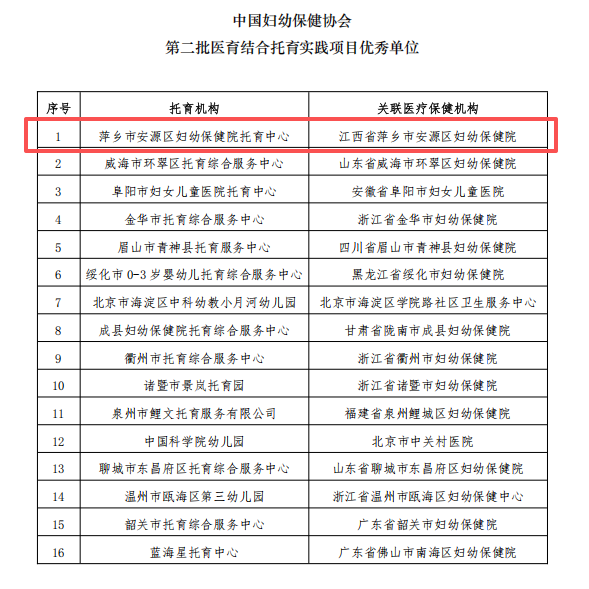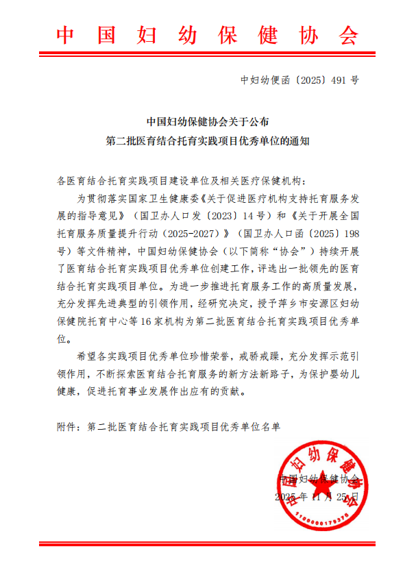 为落实国家“幼有善育”政策要求,深入贯彻婴幼儿照护服务发展相关文件精神、推进医育结合模式创新,中国妇幼保健协会面向全国组织开展优秀托育项目单位评选,2025年12月13日萍乡市安源区妇幼保健院托育服务中心实力上榜,斩获国家级荣誉。